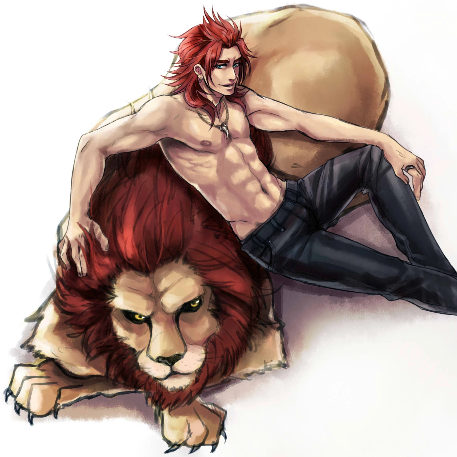 - Emberként: 217 cm magas, vörös hajú, ijesztő külsejű férfi. Világos, nagyon tiszta kék szemit többnyire fekete lencsés napszemüveggel takarja. (Illetőleg zöldes-sárgás színű, mikor próbálja álcázni, ám nem túl tehetséges ebben, könnyen visszaváltoznak a szemei az eredeti tiszta kék színükre) Öltözködésére az elegáns kényelem jellemző. Alakváltó jegye a szíve helyén a mellkasán található. Fehér, oroszlánkölyök foltok formájában.